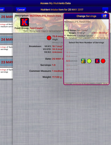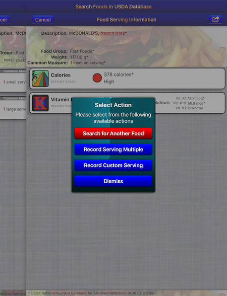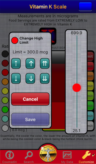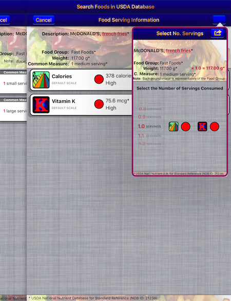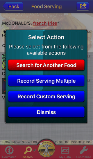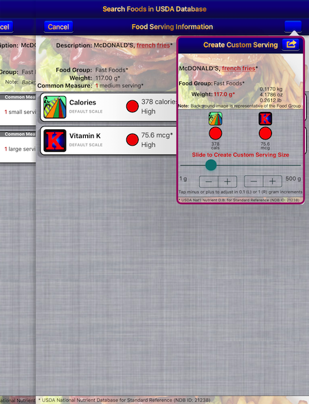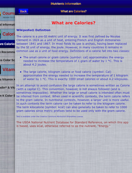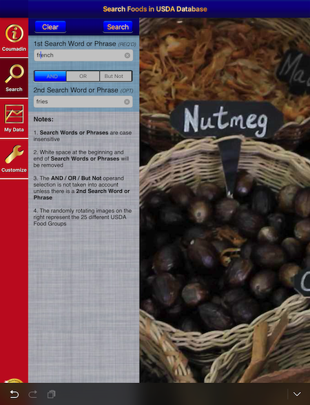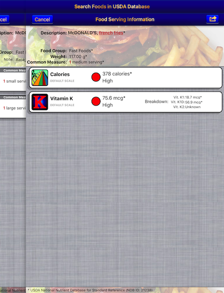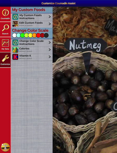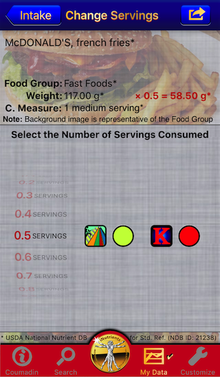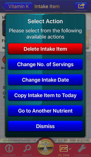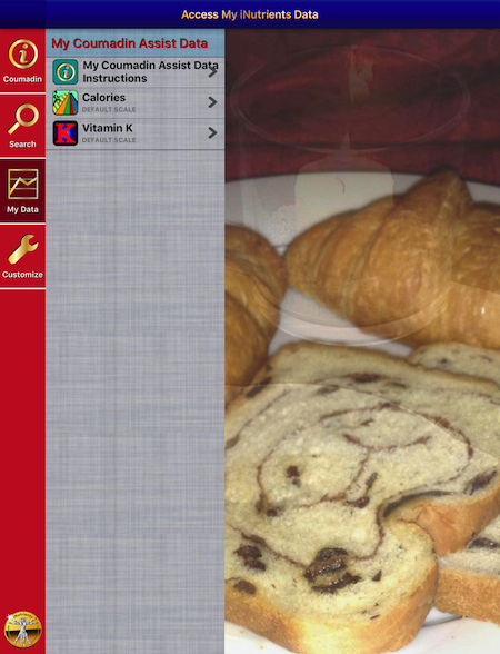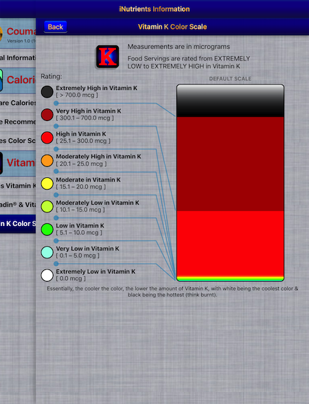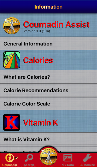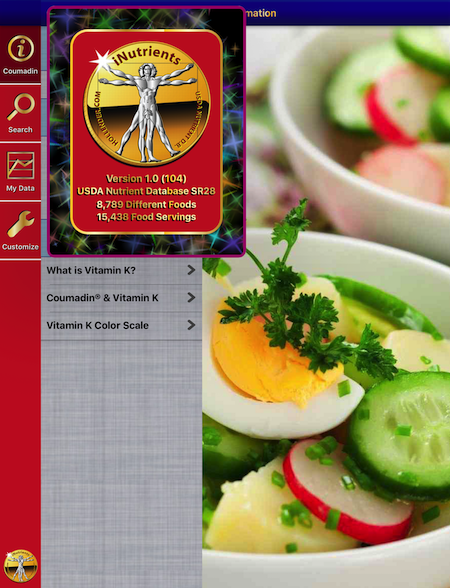 The Coumadin Assist app provides access to Nutrient data for 8,789 different foods and 15,438 different food servings based on the USDA National Nutrient Database for Standard Reference concerning nine different nutrients: