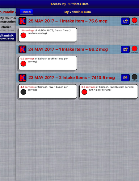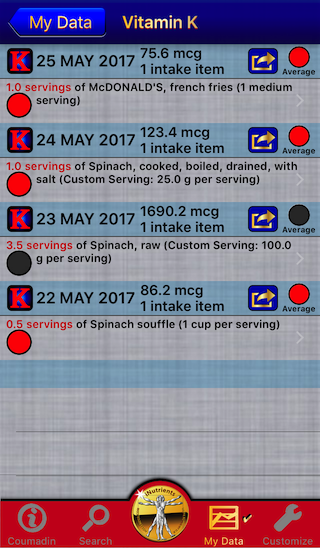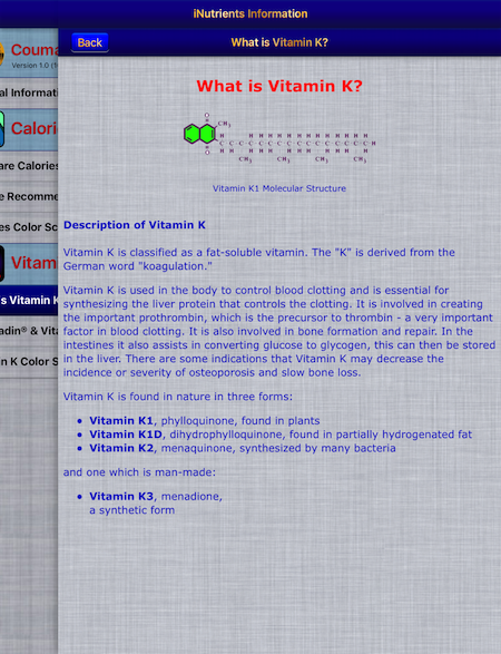 Coumadin Assist utilizes information taken from the entire USDA National Nutrient Database for each of these nine nutrients, unlike the individual apps, which cover less than 10% of what's available.