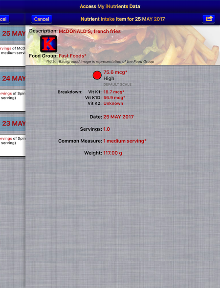 The My Data section allows you to access up to a full year's worth of Food Serving Intake Items stored in your Personal iNutrients Database. Select any Intake Item to get the complete information available. From this display you can tap the Action button in the upper right corner to: