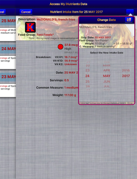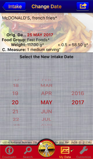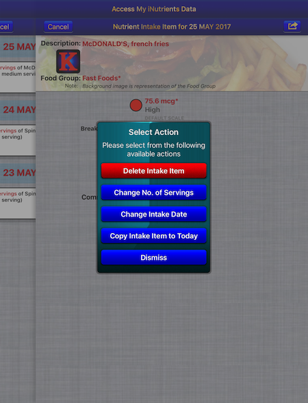 - Change the Intake Date — Move the current Food Serving to another day. — This is extremely useful if you haven't been able to enter what you've eaten on the day it occurred; just simply enter it and then use this function to change to the date needed.