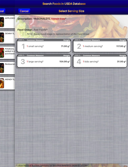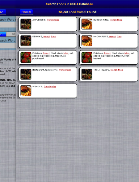 The rotating images occasionally seen on the right, on the iPad only, are representative of the 25 different Food Groups designated by the USDA. You will typically see versions of these images whenever a food group is identified.