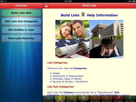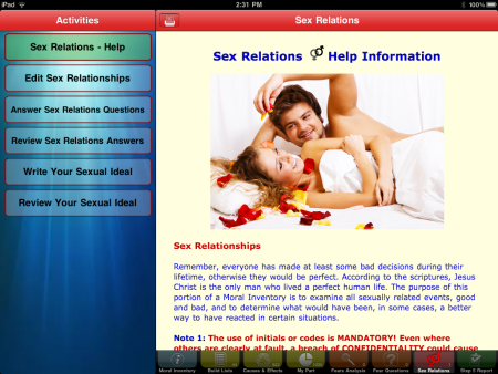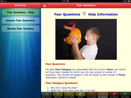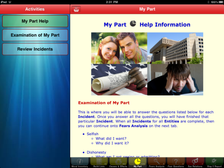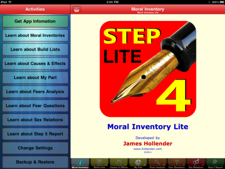 The Lite version includes an optional small, mock Moral Inventory from which you can get an idea how everything works together. This version works exactly the same as the full paid version with just a few differences: Printing, Backup & Restore are disabled and record limitations are imposed.