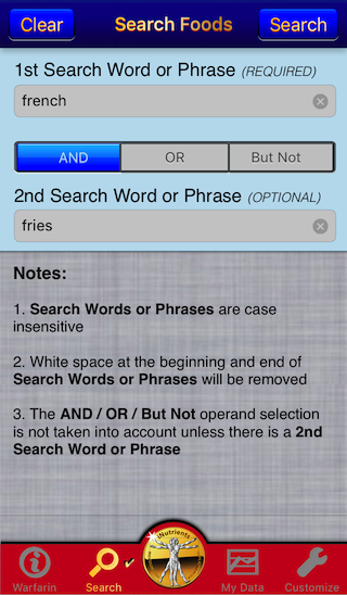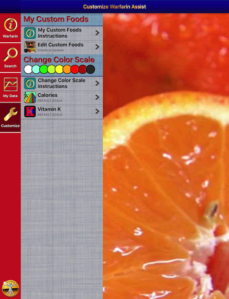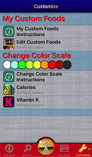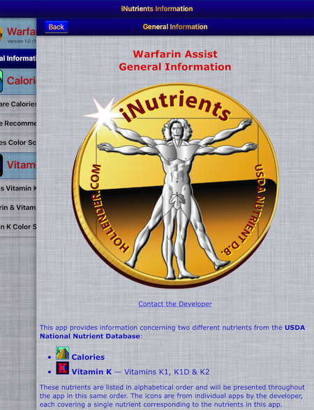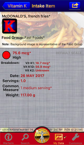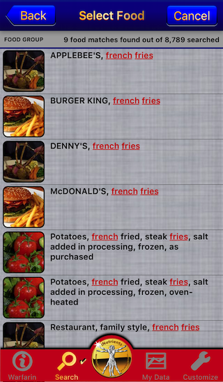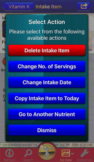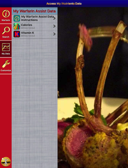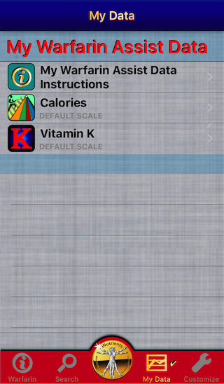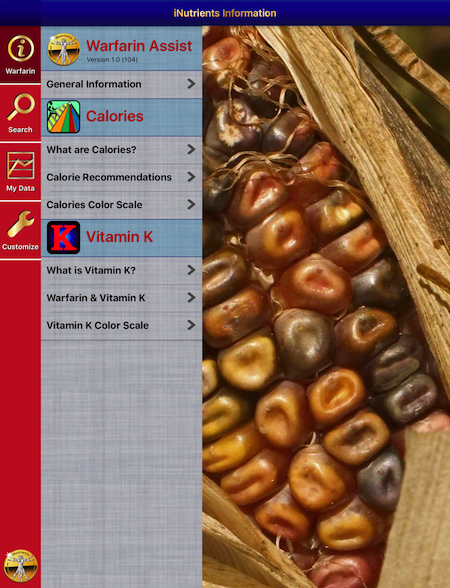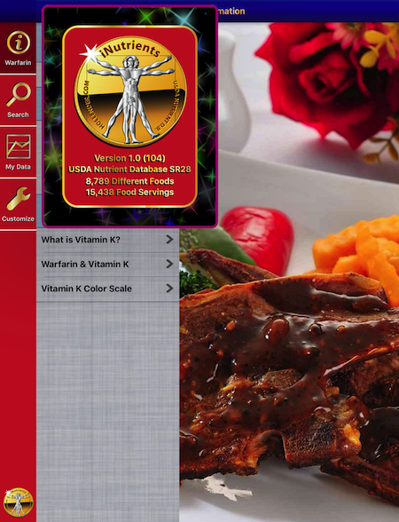 The Warfarin Assist app provides access to Nutrient data for 8,789 different foods and 15,438 different food servings based on the USDA National Nutrient Database for Standard Reference concerning nine different nutrients: