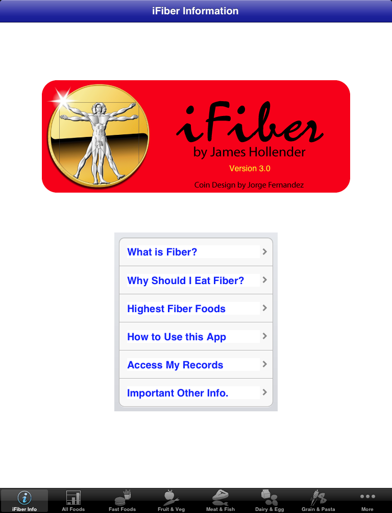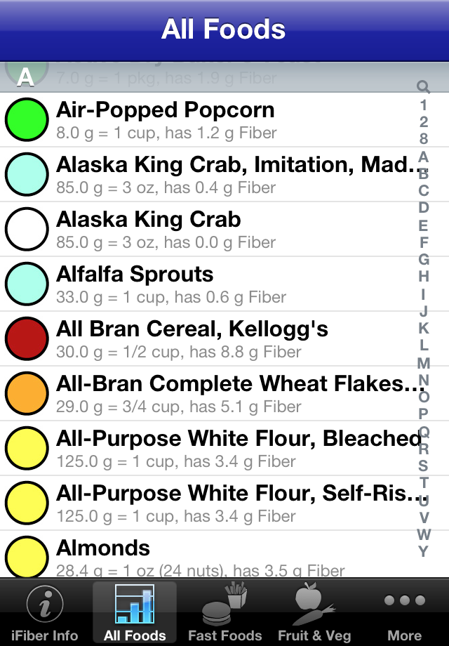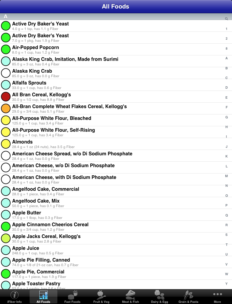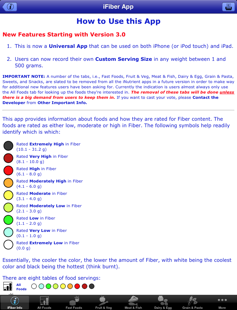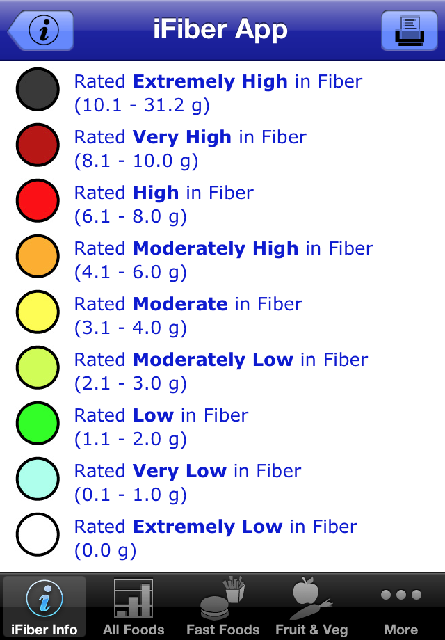 The iFibers app provides information about foods and how they are rated for Fibercontent. This is provided as a means to assist in deciding which foods to eat. The foods servings are rated from EXTREMELY LOW in Fiber all the way up to EXTREMELY HIGH. The following colors help readily identify which is which: