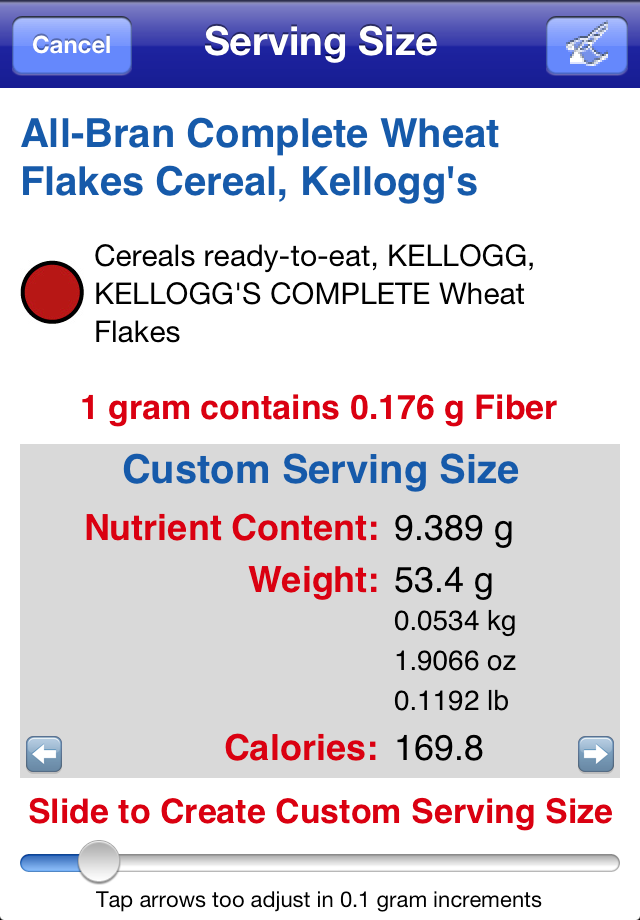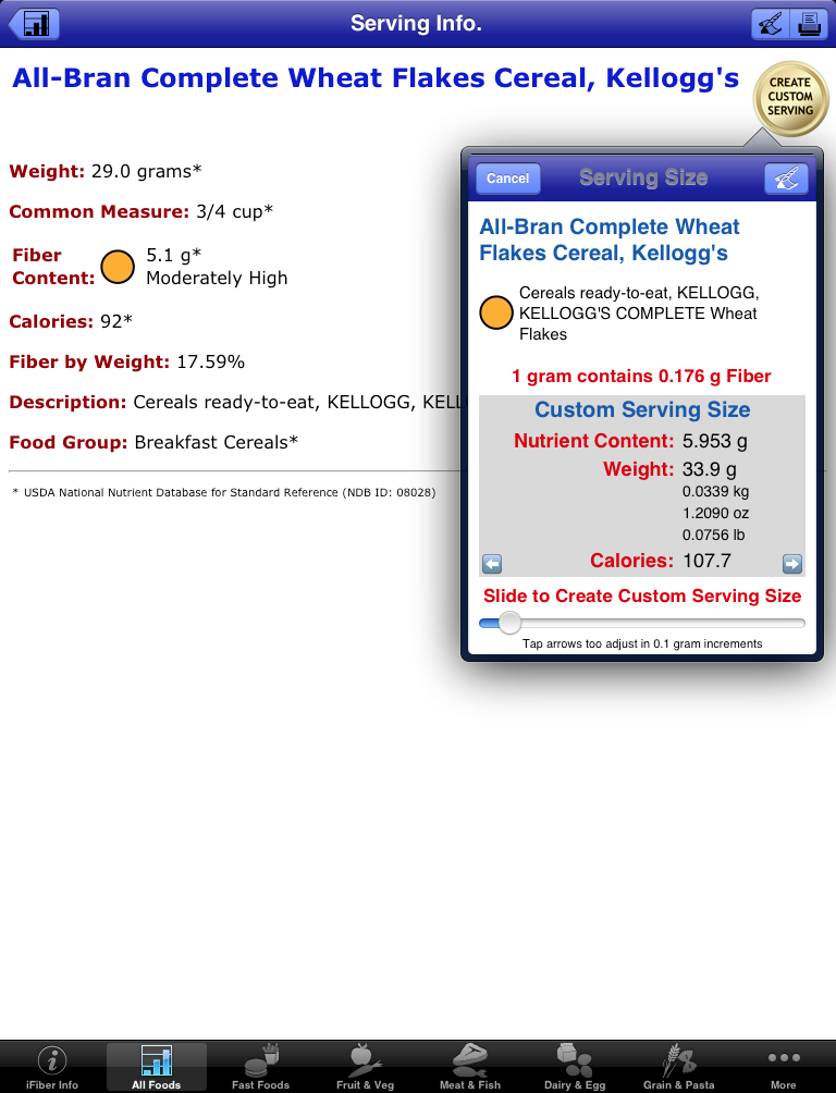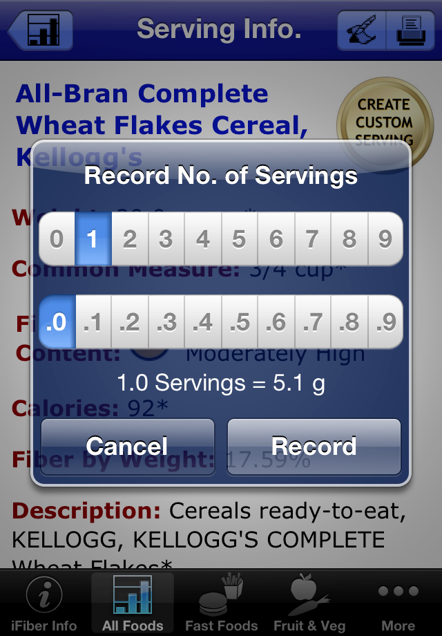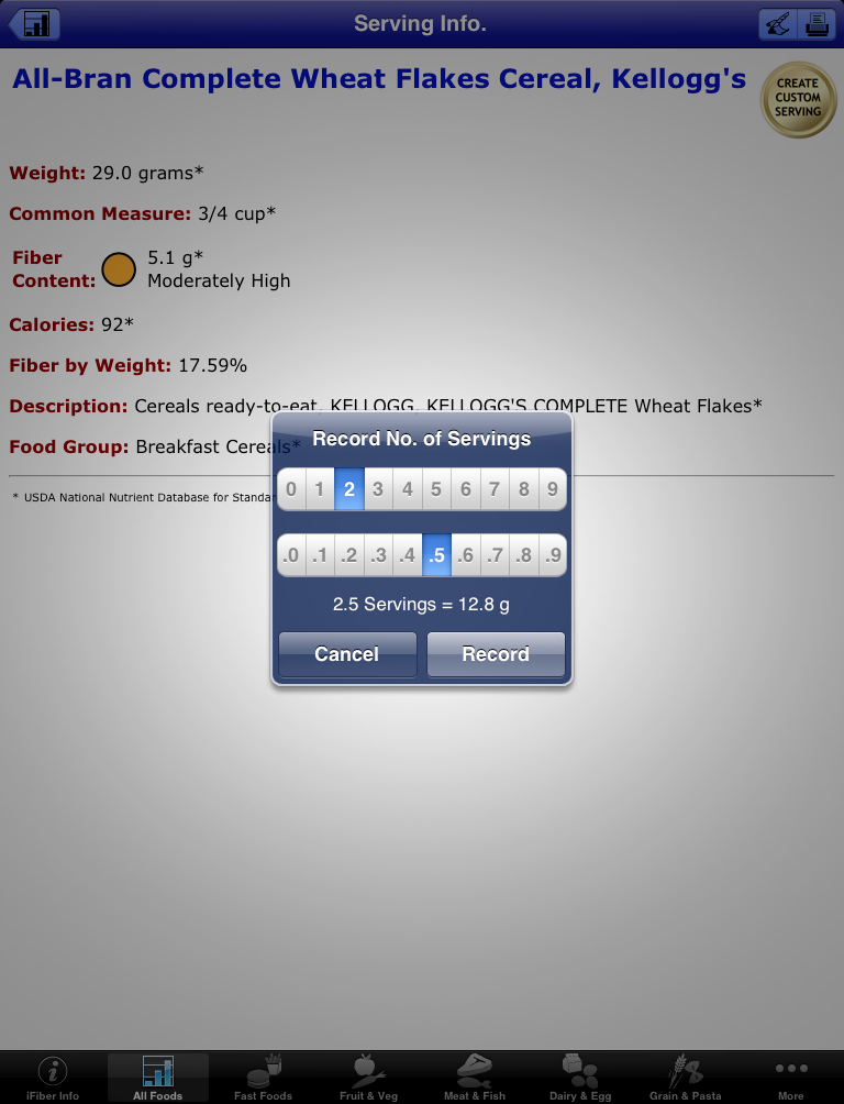 NEW FEATURE Starting in Version 3.0 — User can now Record Custom Servings using the Create Custom Serving button available in the upper right corner of each Food Serving Infomaton page