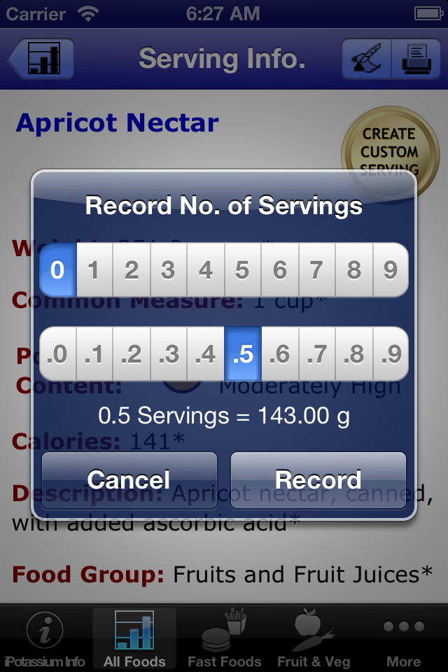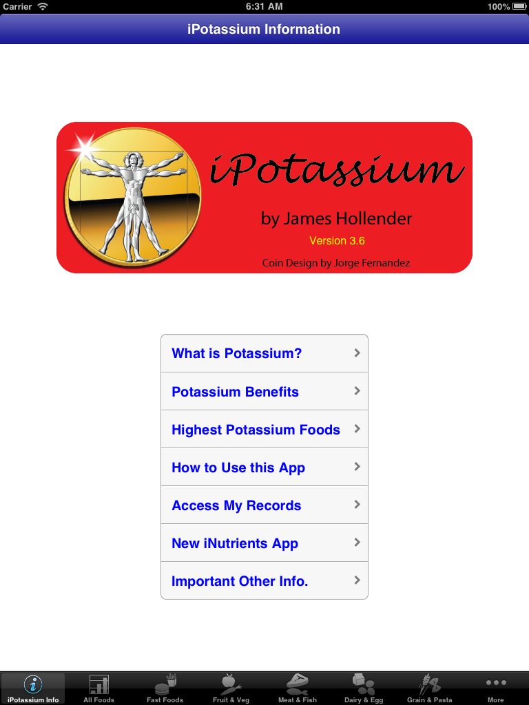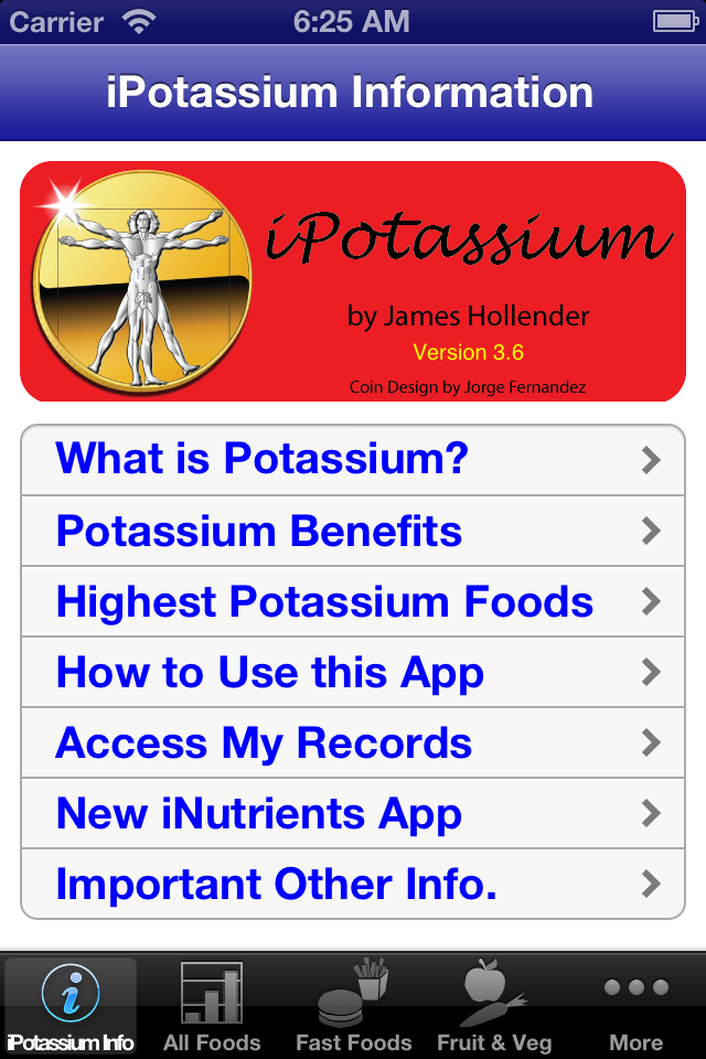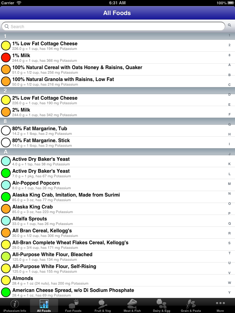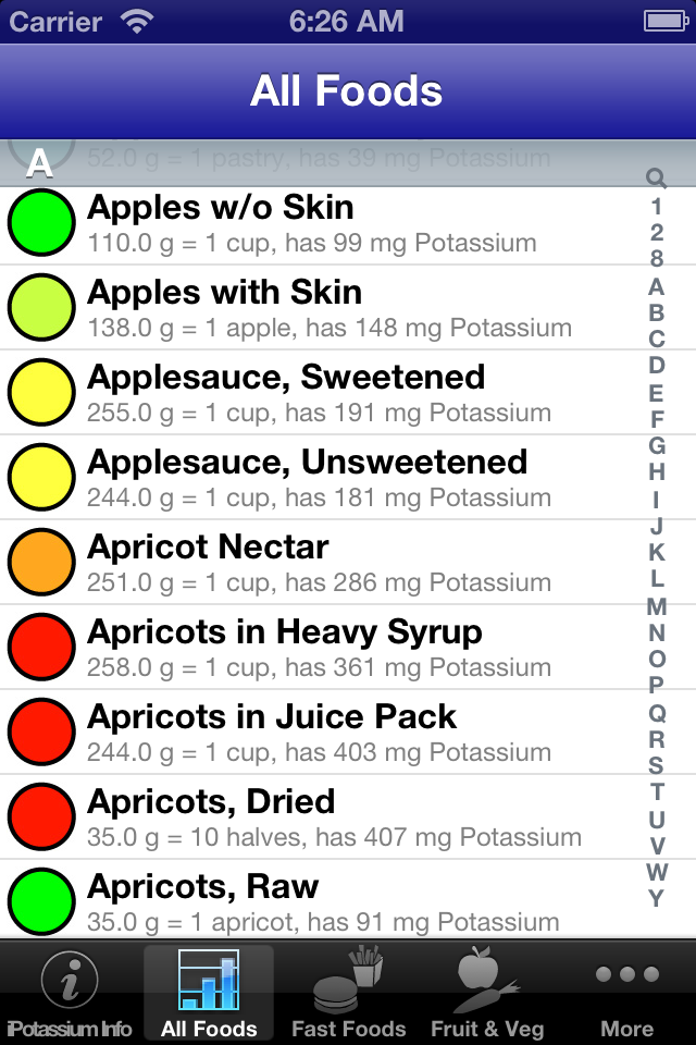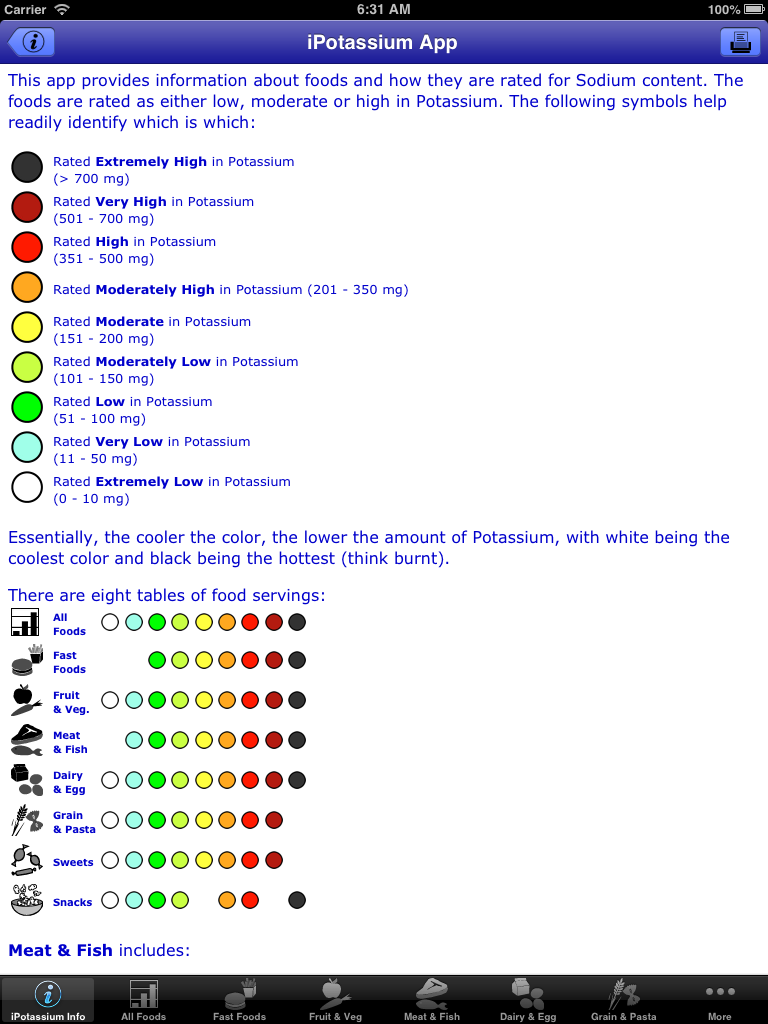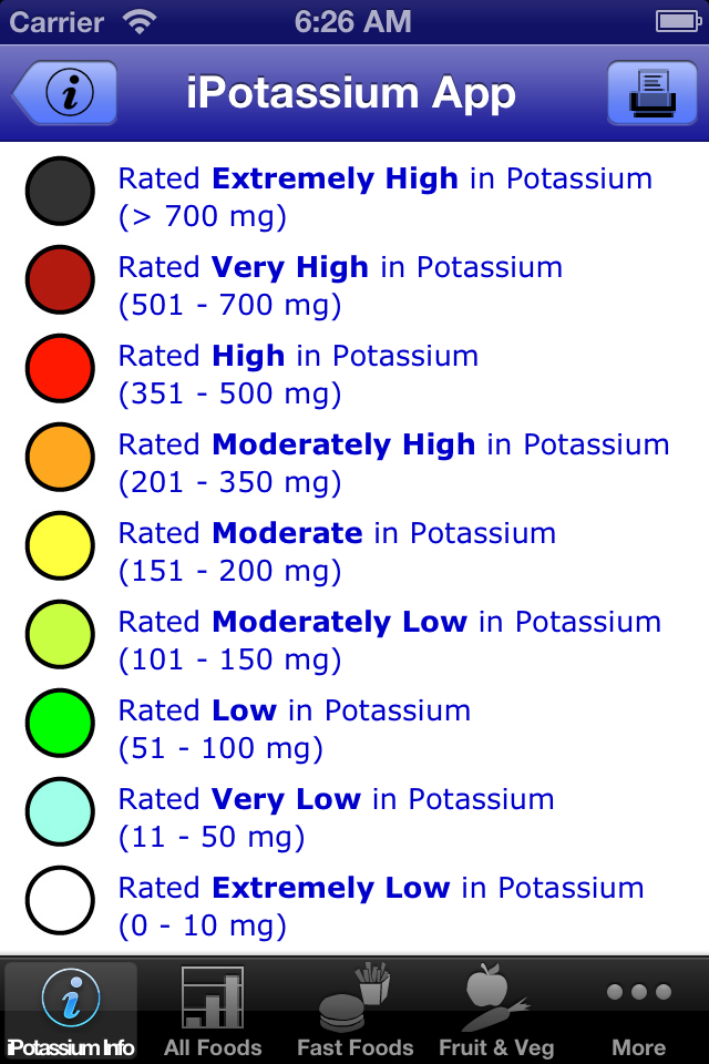 The iPotassium app provides information about foods and how they are rated for content of potassium. This is provided as a means to assist in deciding which foods to eat. The food servings are rated from EXTREMELY LOW in cholesterol all the way up to EXTREMELY HIGH. The following colors help readily identify which is which:
