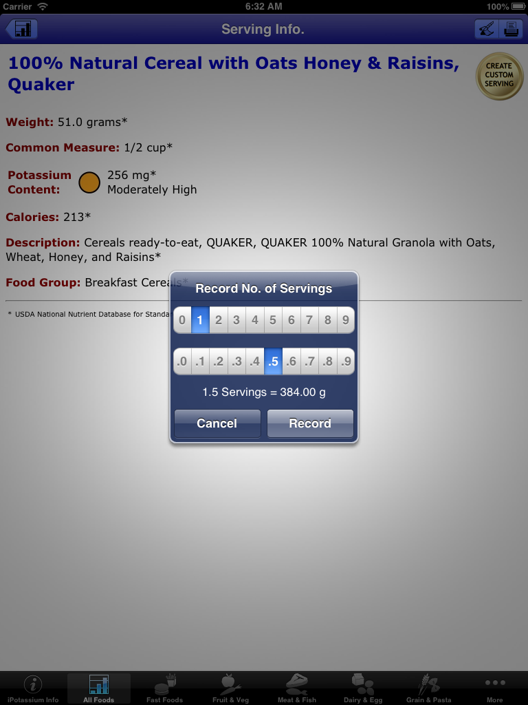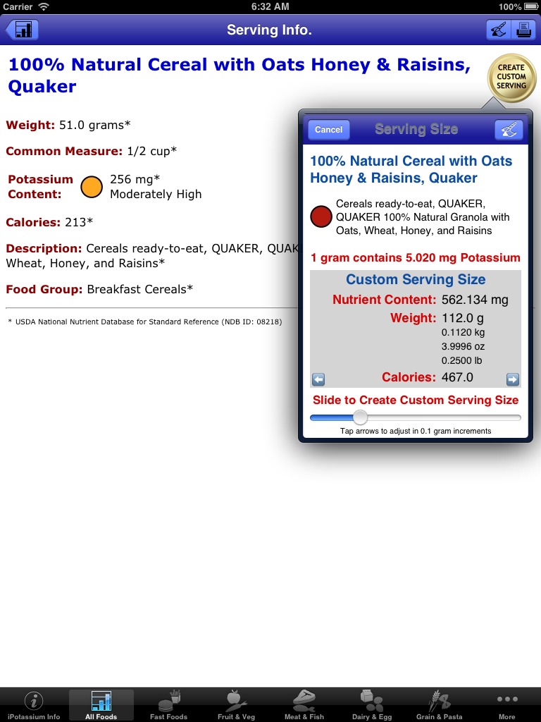 Information is derived from the USDA National Nutrient Database for Standard Reference: Potassium Content of Selected Foods per Common Measure. There are currently over 1,100 different food servings included, searchable using more than 2,500 names (some foods are known by different names or how they are prepared, e.g., "Egg, Scrambled" and "Scrambled Egg"). A few these have as many as six searchable names.