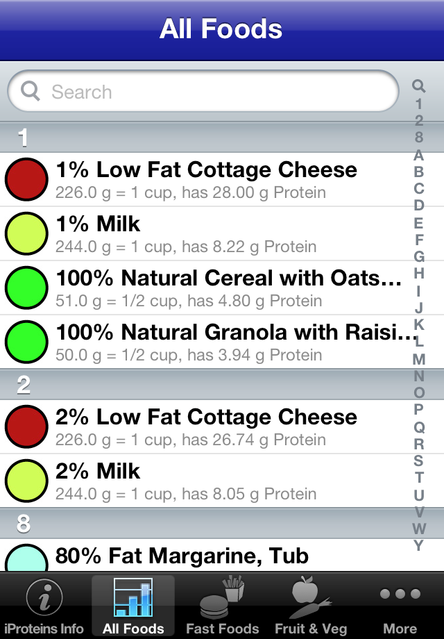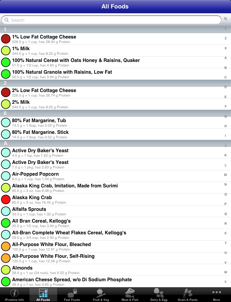There are over 1100 different food servings in iProteins, and you can also search by how a food is prepared (ie: canned versus frozen). Also, food is rated by a handy color coding system for the visually inclined. White means you have an extremely low number of grams of protein in the item. Red means a high count. There’s a range in between, of course.
