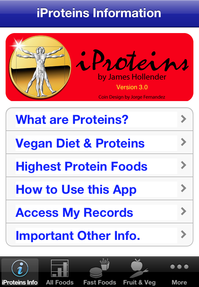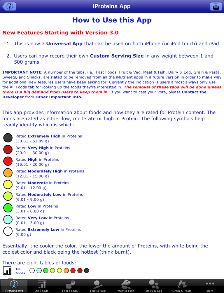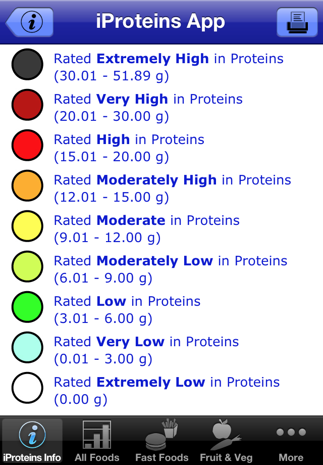 The iProteins app provides information about foods and how they are rated for protein content. This is provided as a means to assist in deciding which foods to eat. If you are a bodybuilder, you probably want to have a high intake of carbohydrates, but on the other hand if you are a vegan then you want to make sure you are taking in a sufficient amount of protein. The foods are rated from EXTREMELY LOW in Proteins all the way up to EXTREMELY HIGH. The following colors help readily identify which is which: