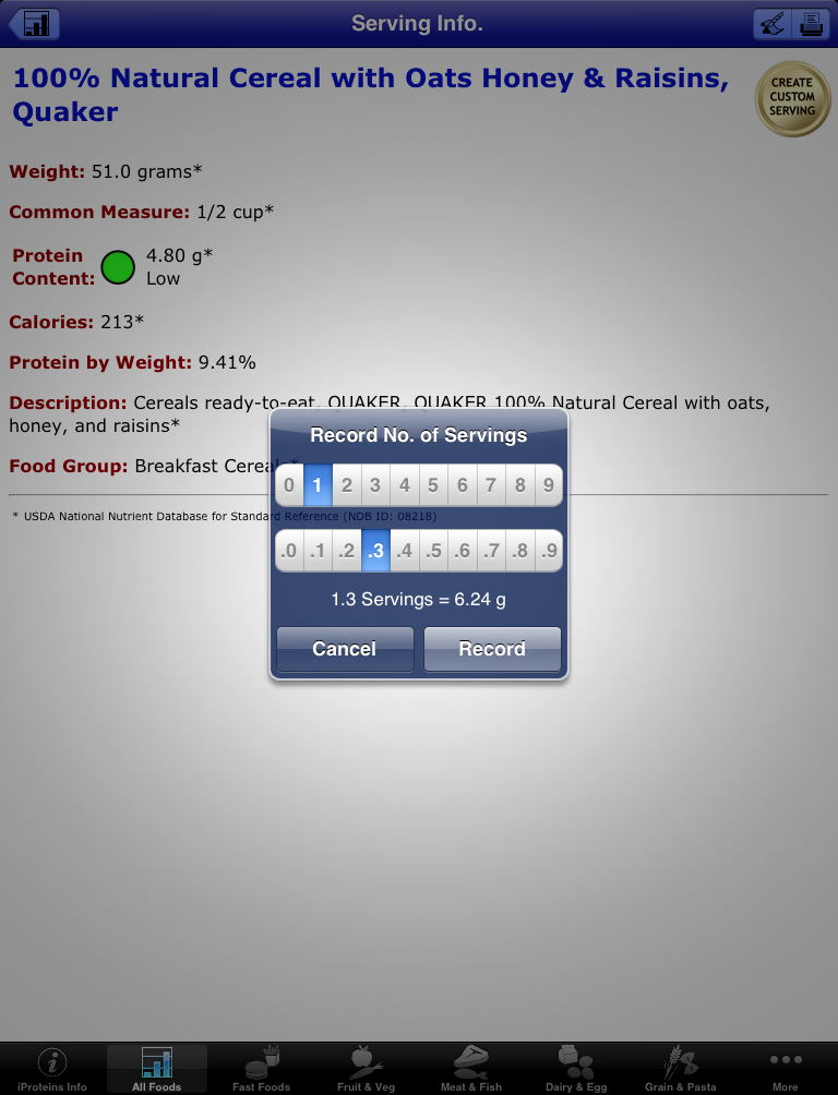 What is the USDA Nutrient Database number, you ask? It’s a number derived from the USDA National Food Nutrient Database for Standard Reference: Protein Content of Selected Foods per Common Measure. It’s actually the data that serves as the basis for the entire app.
