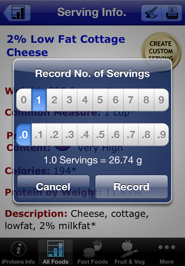 NEW FEATURE Starting in Version 3.0 — User can now Record Custom Servings using the Create Custom Serving button available in the upper right corner of each Food Serving Infomaton page