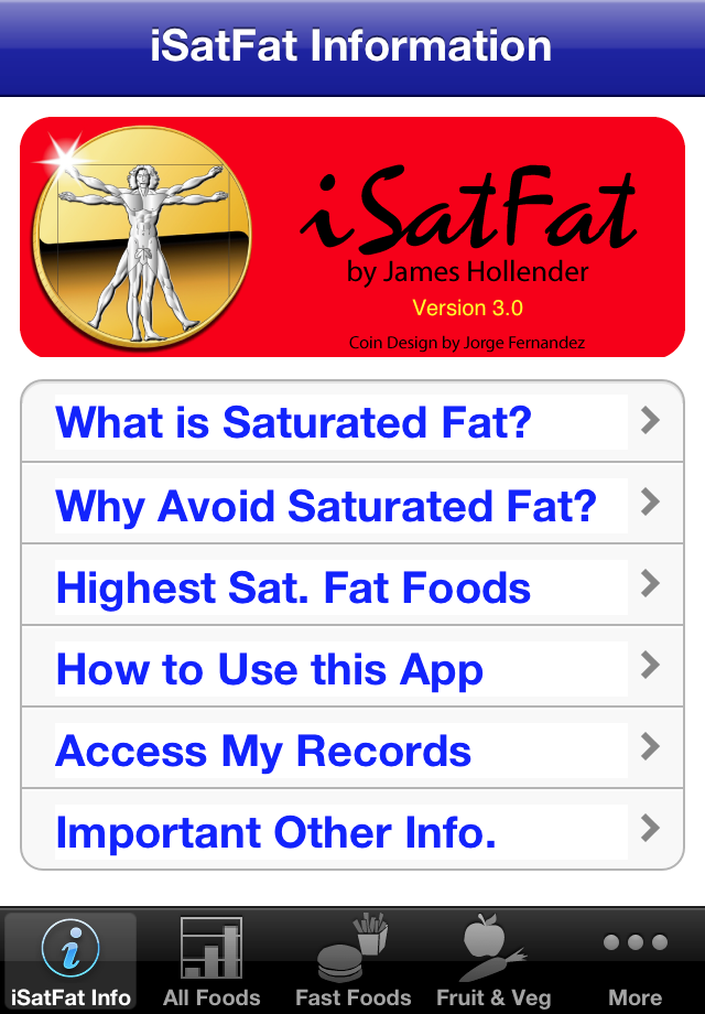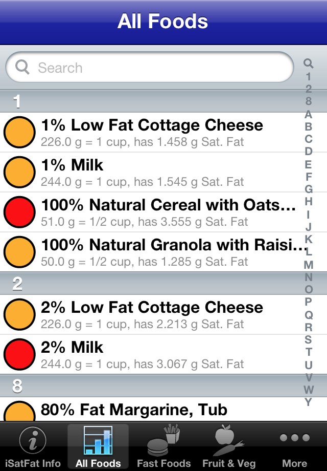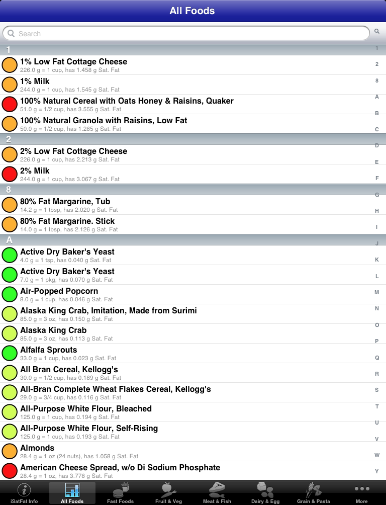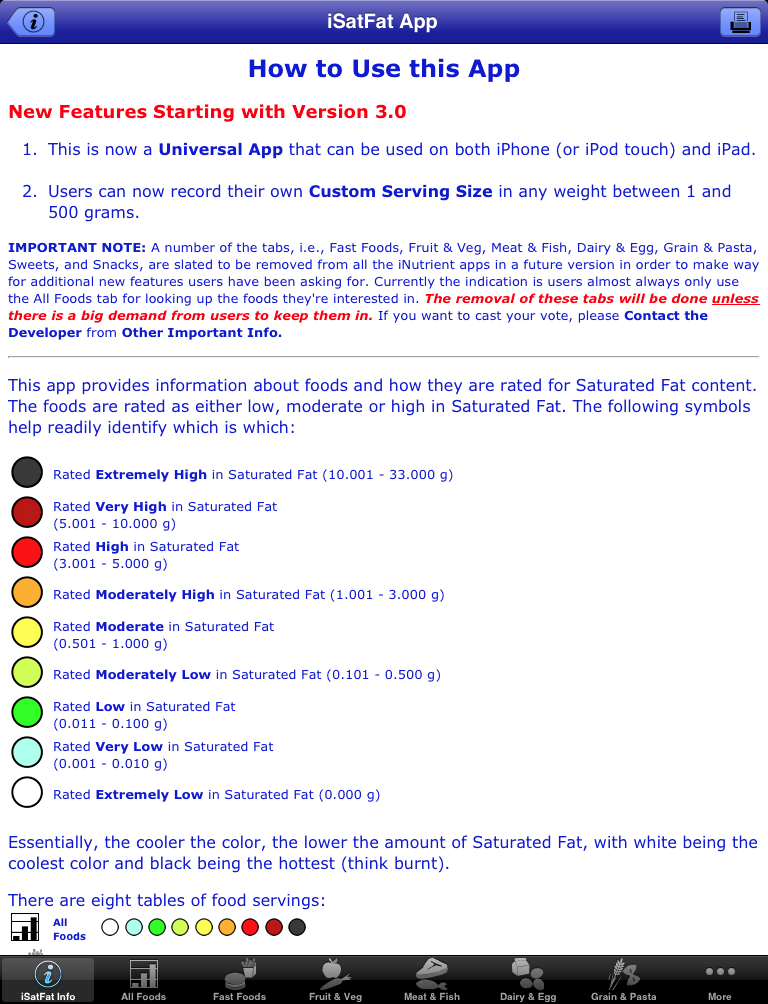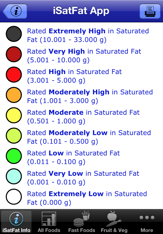 The iSatFat app provides information about foods and how they are rated for saturated fat content. This is provided as a means to assist in deciding which foods to eat. The foods servings are rated from EXTREMELY LOW in saturated fat all the way up to EXTREMELY HIGH. The following colors help readily identify which is which: