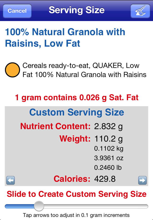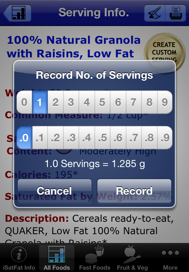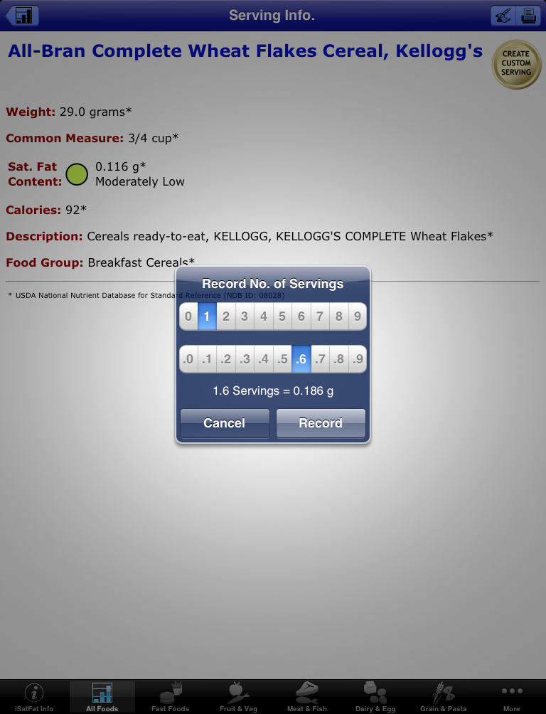 NEW FEATURE Starting in Version 3.0 — User can now Record Custom Servings using the Create Custom Serving button available in the upper right corner of each Food Serving Infomaton page